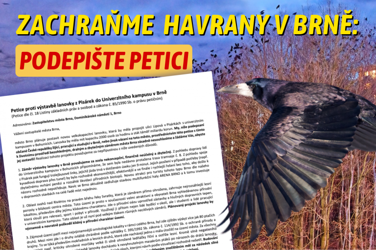 Vložila: ČTK Česká společnost ornitologická podala žalobu proti povolení lanovky z Pisárek k univerzitnímu kampusu, nesouhlasí s biologickým hodnocením a upozorňuje na ohrožení významného ptačího území, včetně posledního velkého nocoviště havranů…