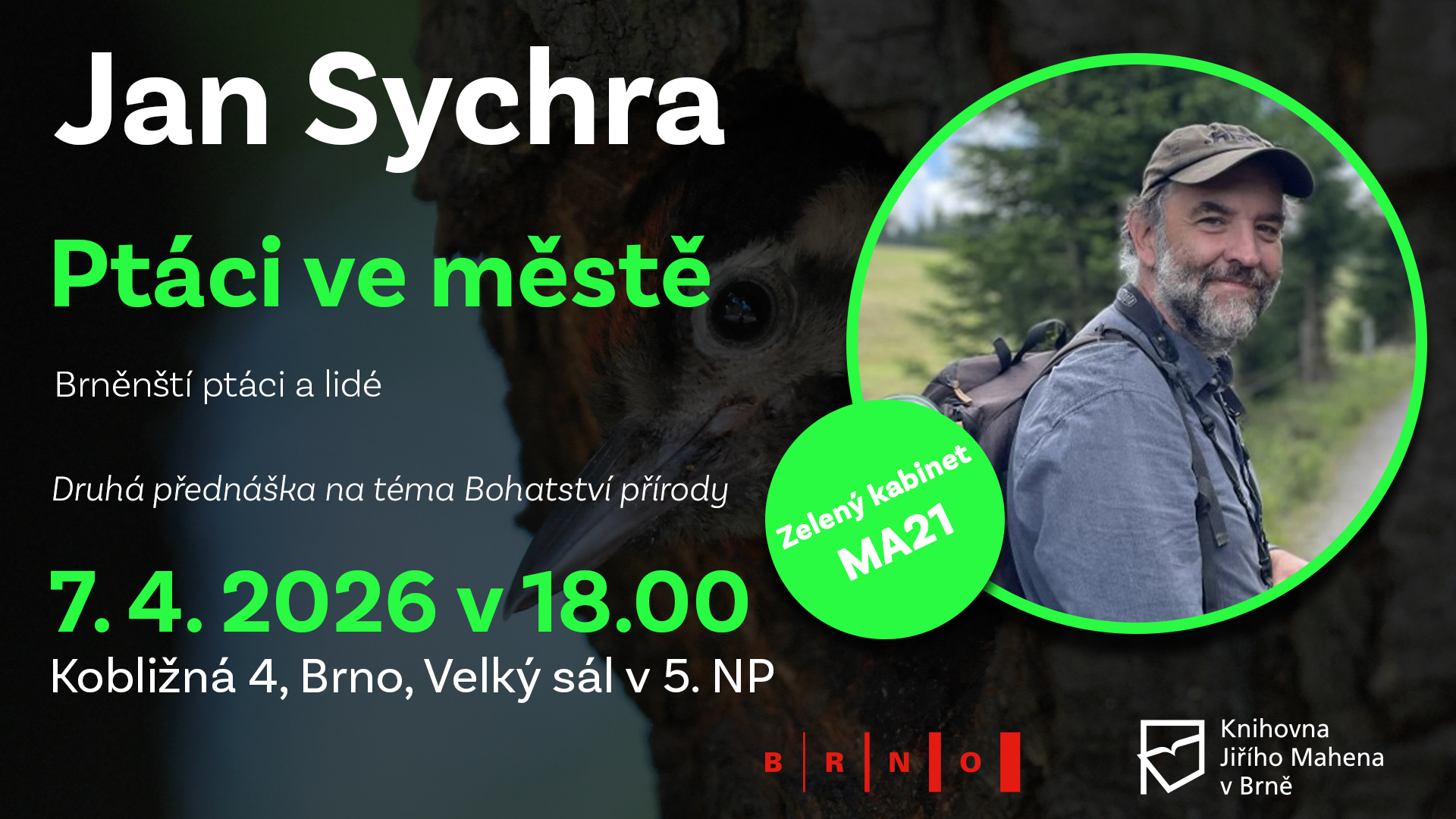Pozor pozor! Dobrá zpráva pro všechny, kteří nestihli zahajovací přednášku letošního Havrance. Biolog a předseda Jihomoravská pobočka České společnosti ornitologické Jan Sychra bude opět přednášet, 7. 4. 2026 v Knihovně Jiřího Mahena. Vysvětlí, proč ptáci stále častěji osidlují města, a představí aktuální poznatky o ptačích populacích v Brně. Zaměří se na významné brněnské lokality, kde lze městské ptactvo pozorovat, a přiblíží také fenomén městské divočiny. Ukáže, jaká ohrožení dnes místní ptáky a jejich biotopy trápí a jaké možnosti nabízí jejich ochrana.