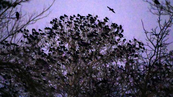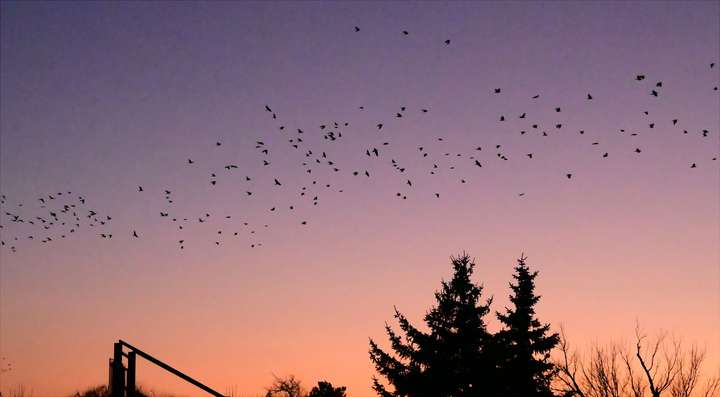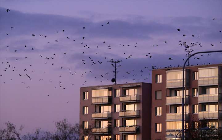 Přiložené fotografie ukazují, jak vypadají hejna havranů a kavek při věčerních přeletech a shromažďování.