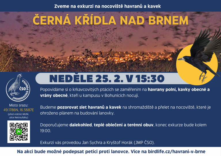 V polovině ledna jsme informovali, že v Brně se plánuje stavba velkokapacitní lanovky, která by ovšem měla devastující vliv na ptáky i přírodu, přičemž v bezprostředním ohrožení by bylo největší jihomoravské zimní nocoviště havranů. Téma vzbudilo velký ohlas médií a veřejnosti, za což velmi děkujeme! Nyní můžete podepsat oficiální petici a zúčastnit se exkurze na nocoviště havranů, kavek a vran. Mnohé další kroky chystáme, abychom mohli společně ochránit tuto unikátní lokalitu.